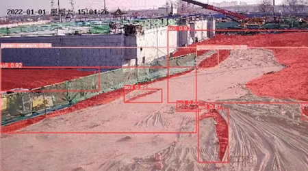 AI monitors the status of exposed soil on the construction site in real time, providing coverage data such as the percentage of soil covered, which is then sent to the platform for further analysis.
